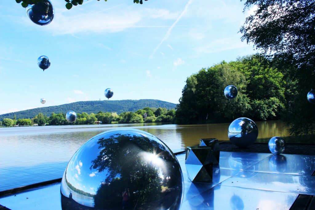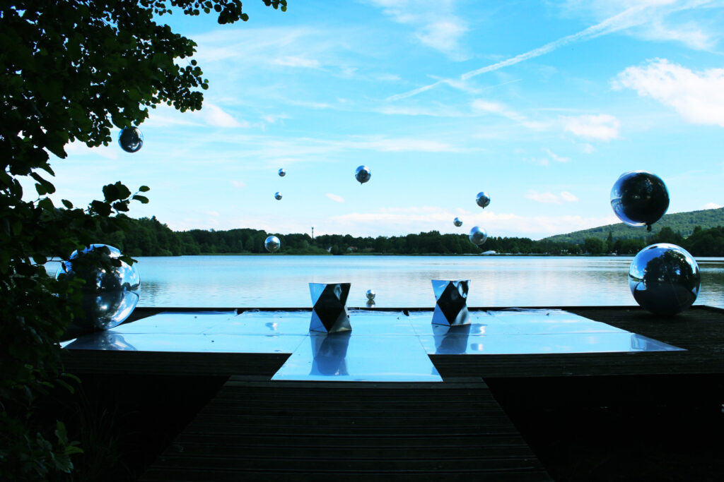 Jouant des reflets des flots et du ciel, d’astres brillants de poussières d’étoiles gonflés à l’hélium associés aux scintillements de lumière émergeant des feuillages, l’installation crée une dimension cosmique entre les corps des musiciens et leur environnement. La simplicité des éclats lumineux offre aux caméras un panel de cadrages insolites, un écrin sublimant musique et voix pour des présences chargées de puissance naturelle.